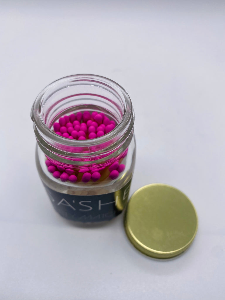 Light your candle in style with our wood safety matches. Strike the match on the back of the jar with our striker. Choose from hot pink or black matches.